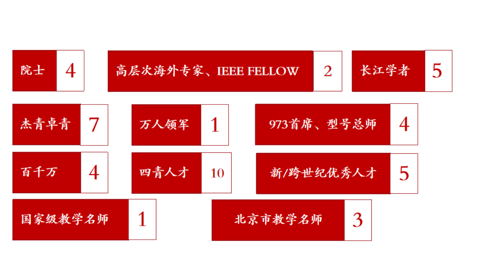 学院现有教职工245人,队伍汇聚了40人次国家级高层次人才、教学名师以及8个国家/省部级创新团队。其中包括:王越、毛二可、张军、龙腾4名全职院士、2名IEEE fellow13人次国家高层次人才项目专家、4名百千万人才工程国家级人选、2名国防科技卓越青年人才基金获得者10位国家高层次青年人才5位新/跨世纪优秀人才、1名国家级教学名师、3北京市教学名师。此外,拥有2个国家级教学团队、1个国家自然科学基金创新研究群体、2个教育部“创新团队发展计划”、2个国防科技创新团队、1个全国高校黄大年式教师团队。