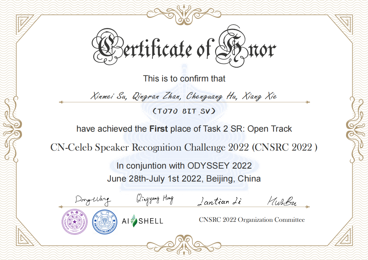 本次竞赛吸引了132支海内外队伍参赛。历经近四个月的角逐,我校谢湘老师组建的BIT_SV小队 (Team ID T070)尝试了多种模型算法对领域内SOTA模型ECAPA进行改进调优,最终采用数据增广、多尺度卷积、多池化融合等方法,在不同阶段调整不同的超参,使模型可以在复杂且大量的数据池中检索出正确的相同说话人句子,有效地提高了模型的鲁棒性。