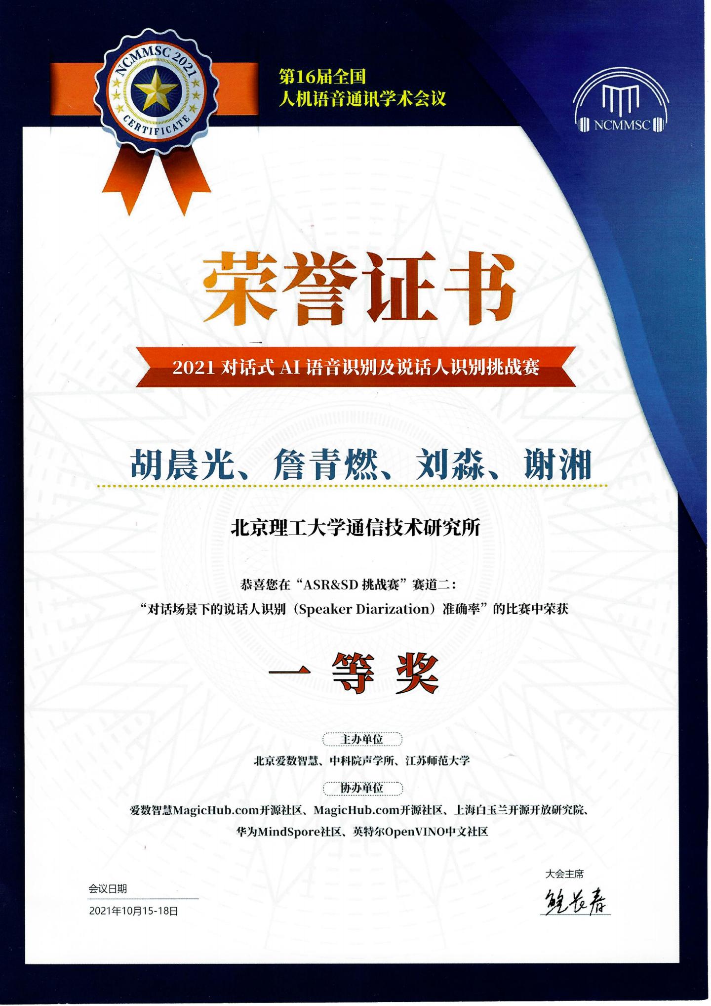 图四. 2021年全国人机语音通讯会议——对话场景下的说话人识别挑战赛第1名证书